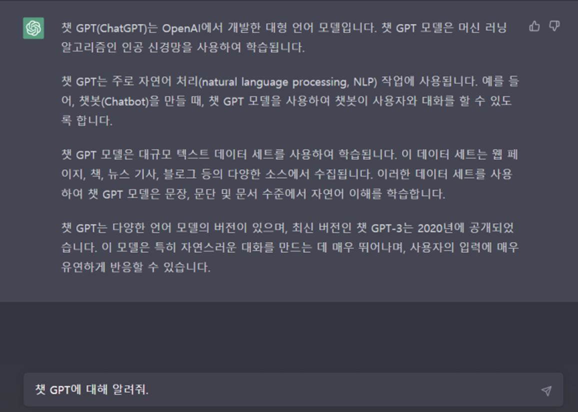 오픈 AI가 공개한 사용자의 질문에 따라 대답하는 대화전문 인공지능 서비스입니다.
